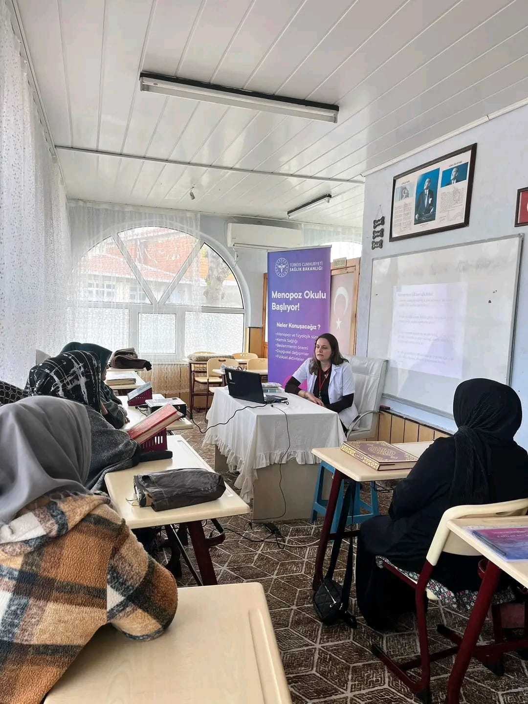 Kurumda görev yapan hemşire ve diyetisyen tarafından, Hacı Cavit Camii’nde kursiyer olarak bulunan kadınlara yönelik “Menopoz Akademisi” eğitimi ile “Menopoz Döneminde Sağlıklı Beslenme” konularında bilgilendirme programı düzenlendi.