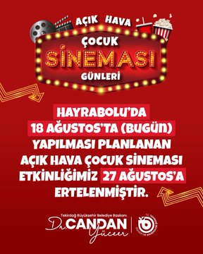 Tekirdağ Büyükşehir Belediyesi tarafından 18 Ağustos’ta yapılması planlanan Açık Hava Çocuk Sineması etkinliği, ileri bir tarihe ertelendi.